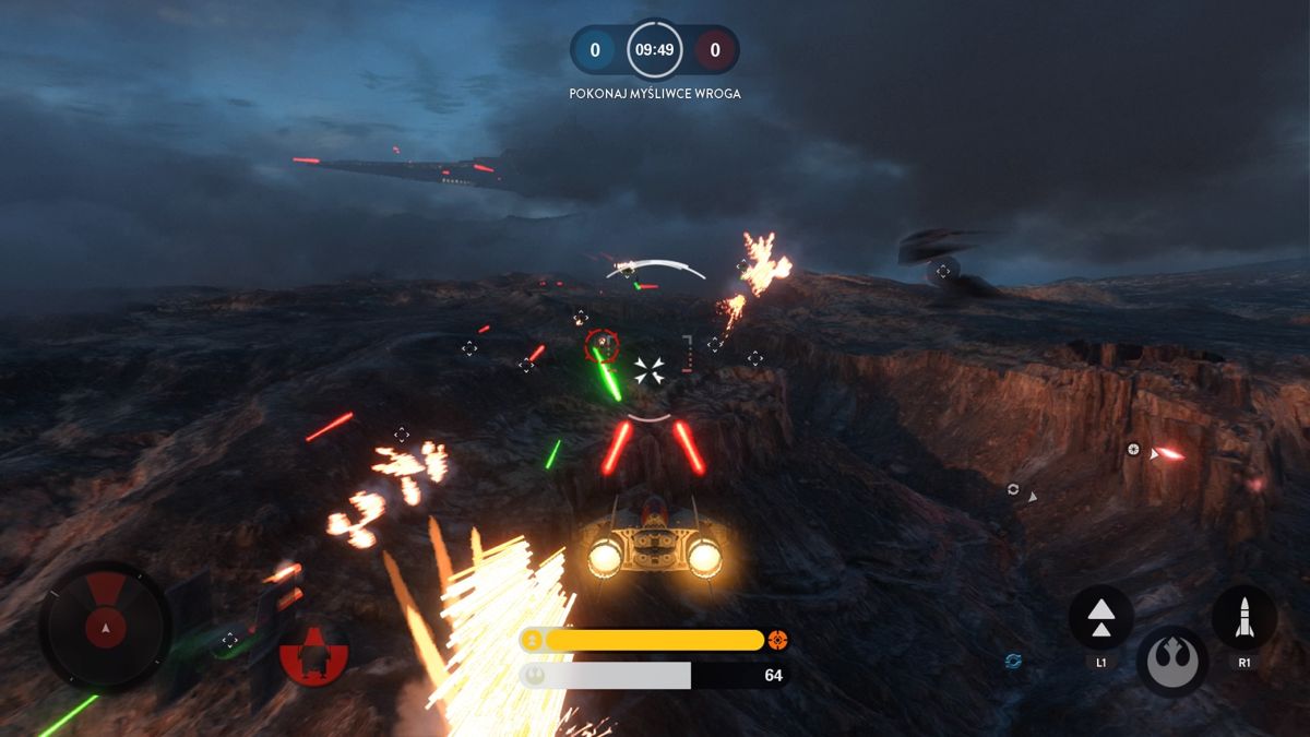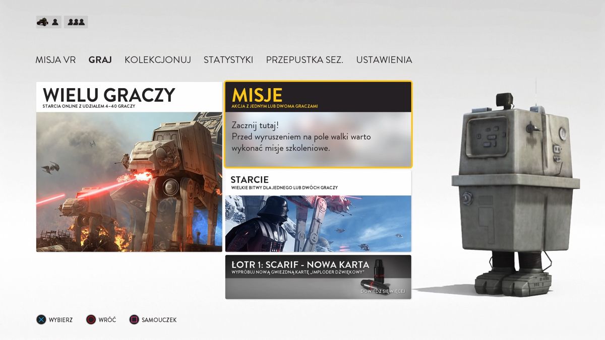 There are nine multiplayer game modes, supporting eight up to 40 players simultaneously. Blast is a classic team deathmatch mode for up to 20 players. Cargo is a capture-the-flag variant with cargo boxes. Droid Run for up to 12 players is about capturing and holding three GNK Power Droids. Drop Zone for up to 16 players is about controlling escape pods that crash down. Fight Squadron is a dogfight mode between air vehicles. Supremacy is a tug-of-war mode similar to Conquest in Battlefield. Players need to capture five control points and then a final one with a specific order. Walker Assault is an asymmetrical mode of Imperials with a giant AT-AT moving towards a rebel base. The rebels need to stop the advance by capturing points that make the AT-AT more vulnerable and calling in Y-Wing bombers. For the heroes in the game there is Heroes vs Villains and the asymmetrical Hero Hunt where one hero takes on seven regular troopers. The single-player portion consists of Missions that can optionally be played cooperatively. They contain wave based survival games, AI bot deathmatches (optionally as a hero character) and training missions.