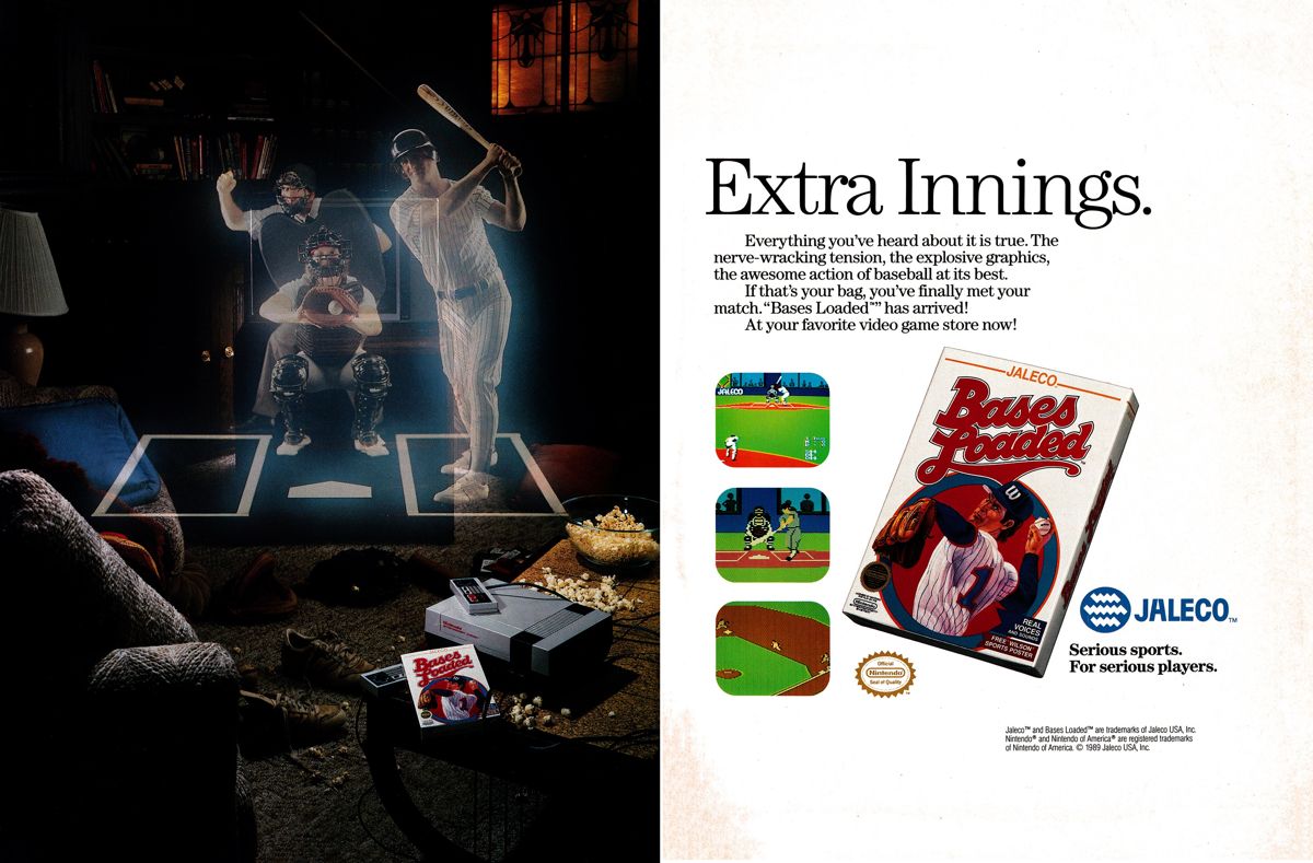 Bases Loaded is a baseball action game for one or two players featuring a large variety of options and realistic graphics and sound. You can select from twelve different teams and choose a lineup for each team. Each team has 30 players with different characteristics to learn. During gameplay you can control all of the positions in the field and pitch everything from a fast ball to curve ball. When at bat you can try to hit a homerun, bunt, or steal bases. Play can be a single game or a complete pennant.