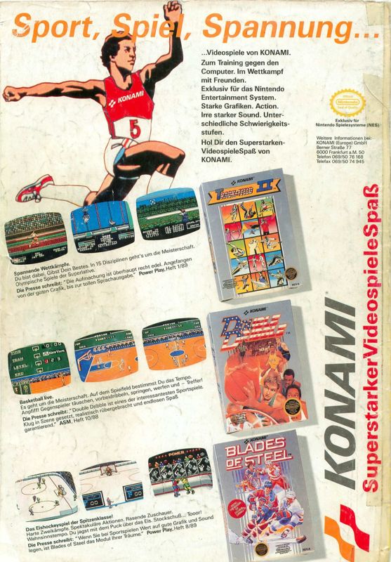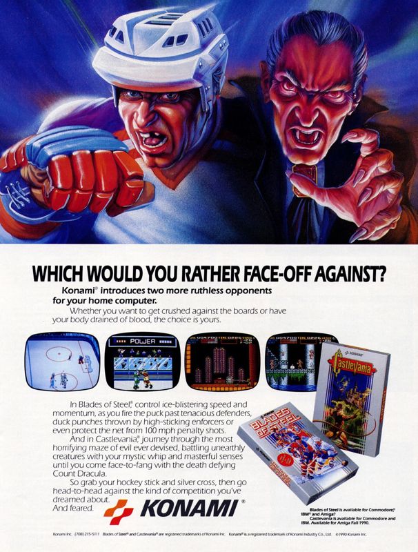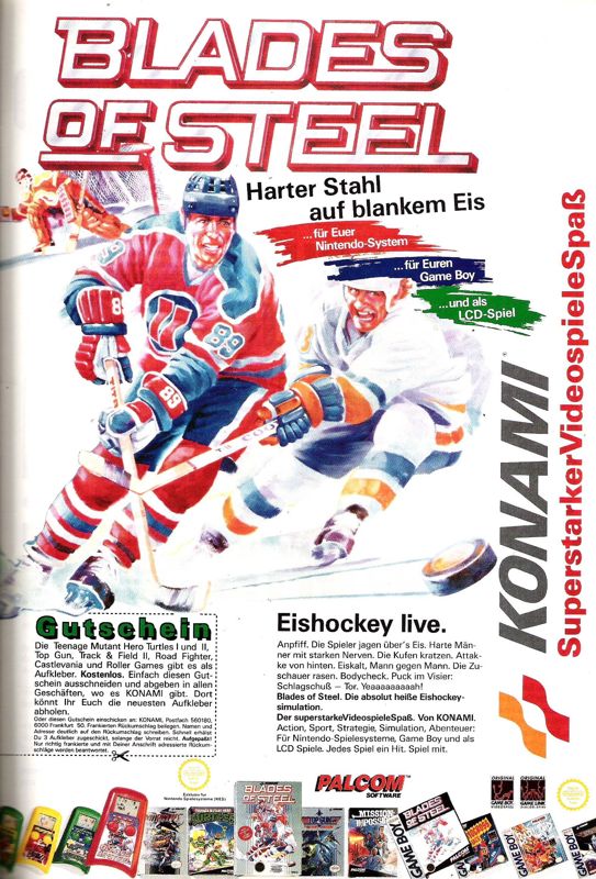 Based on the arcade game, Blades Of Steel is a hockey arcade action game (gameplay doesn't require the need to worry about statistics or provide the ability to customize teams). Two players can play against each other, or one player against the computer. In one player mode there are single game and tournament mode options. From time to time a fight may break out, which will provide a close up view of the two players. The player has control during the miniature fight game sequence, with the loser having to spend time in the penalty box. The referee will break up fights that go on too long, and calls a few penalties such as icing. Several short clips of digitized voices are also featured.