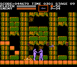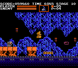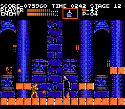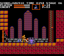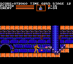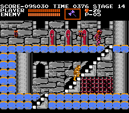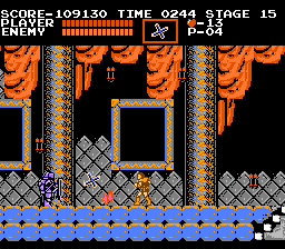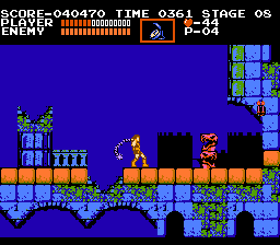 Resource and item management underpin the action. Hearts, earned from candles and enemies, fuel sub-weapon use but do not restore health. Roast meat hidden in breakable walls replenishes vitality. Additional pickups provide temporary enhancements such as the Double Shot and Triple Shot, which let Simon throw multiple sub-weapons in quick succession, and invincibility or increased points. Extra lives are awarded at score thresholds or by rare 1-Up items, while stage-specific hazards, such as moving platforms, collapsing bridges, and fire traps, test precision.