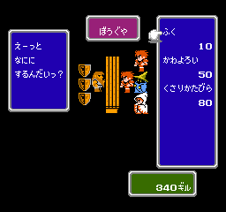 Final Fantasy is played with an adventuring party rather than with a single character. Before the game starts, the player chooses four characters from six different classes: Fighter, Thief, Black Belt, White Mage, Red Mage, and Black Mage. He also gives the characters names.