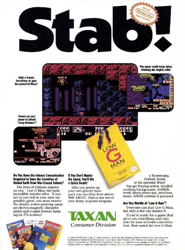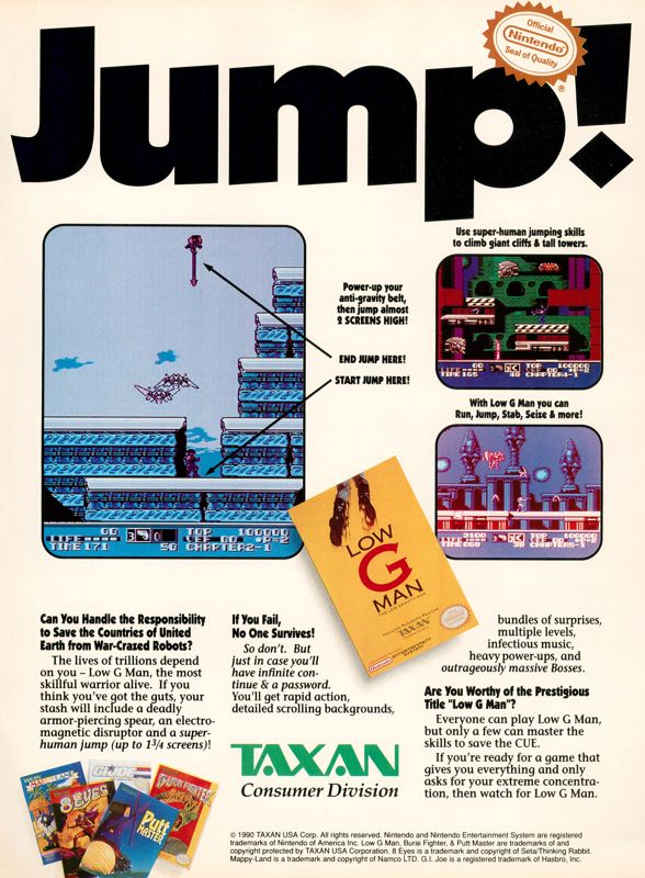 When powered up, you can jump one and three quarters screens high. Capture and use enemy vehicles, including the spider vehicle which can crawl on ceilings. Catch and power up enemy weapons, and much, much more.