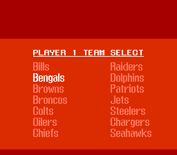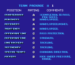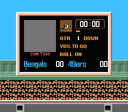 The player is in control of the action from a side-scrolling perspective. The camera also zooms in for closeups on receiving plays. However, NFL is also a very strategic, coaching-oriented take on the sport, featuring large playbooks (team plays are included on a separate fold-out sheet bundled with the game manual, but not onscreen in the game itself), limited customization of team skills, and penalties.