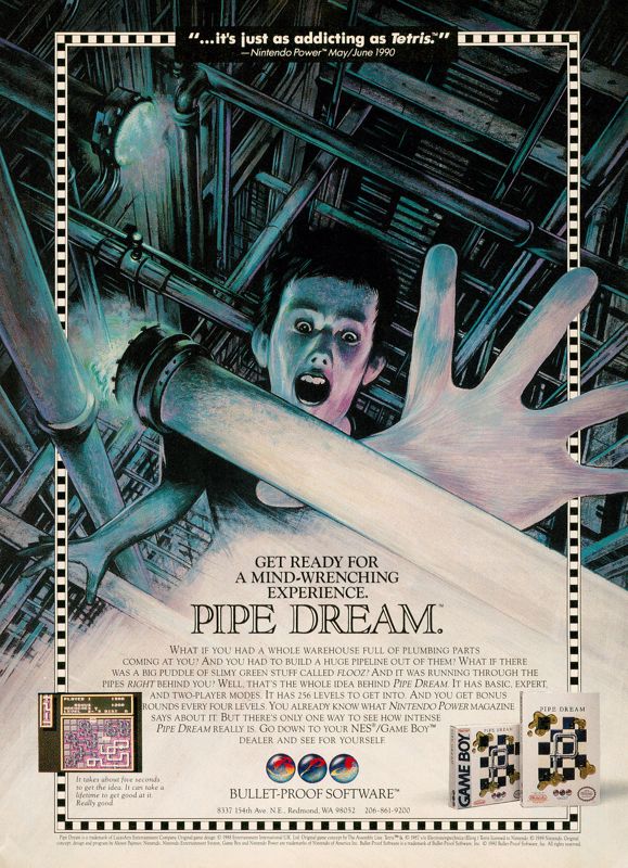 PIPE MANIA - ADDICTION BEYOND BELIEF! Pipe Mania is "a classic puzzle arcade game that is so addictive, it should come with a Government Health Warning!" C & VG Feb 1990. Pipe Mania is a game of great ingenuity, simple in concept and fiendishly challenging to play. You'll need to act instinctively, but think strategically! One wrong move, one brief hesitation or mis-placed pipe section, and you'll drown in a sea of slime! "Buy this game and you may never sleep again" Zero March 1990