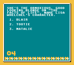 Remote Control is based on the MTV quiz show of the same name. During the game three contestants (computer or human controlled) compete by answering questions about various TV shows, movies, characters, or actors/actresses. There are two rounds of gameplay followed by a third "think real fast" round.