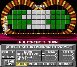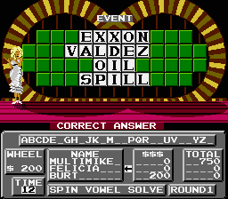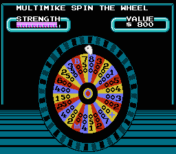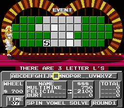 Wheel of Fortune: Family Edition is one of a series of NES games based on the famous TV game show. The goal is to solve a word puzzle by guessing letters. The players take turns spinning a wheel that has designated money amounts in most spaces, but can also bankrupt the player in the wheel lands on the wrong space. A player can guess a letter and if that letter is in the puzzle, those spaces are flipped to reveal the letter and the player earns the cash amount specified by the wheel spin, multiplied by the number of occurrences of the letter. Only English consonants can be guessed-- the 5 English vowels can be purchased using a player's earnings.