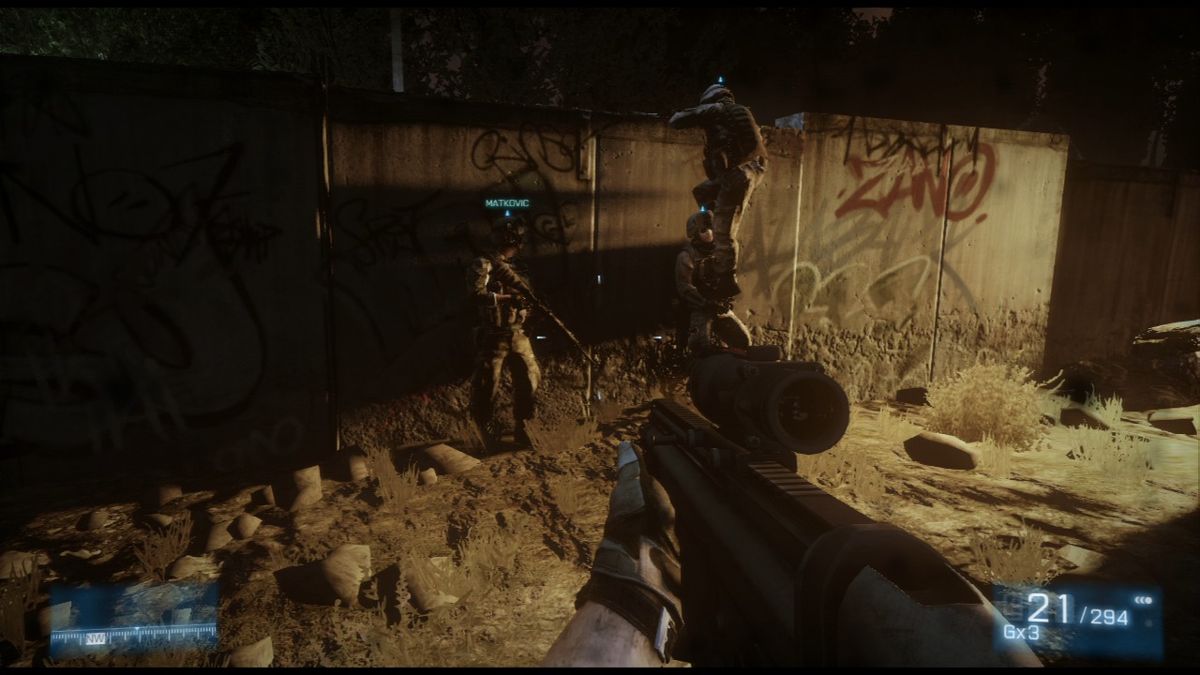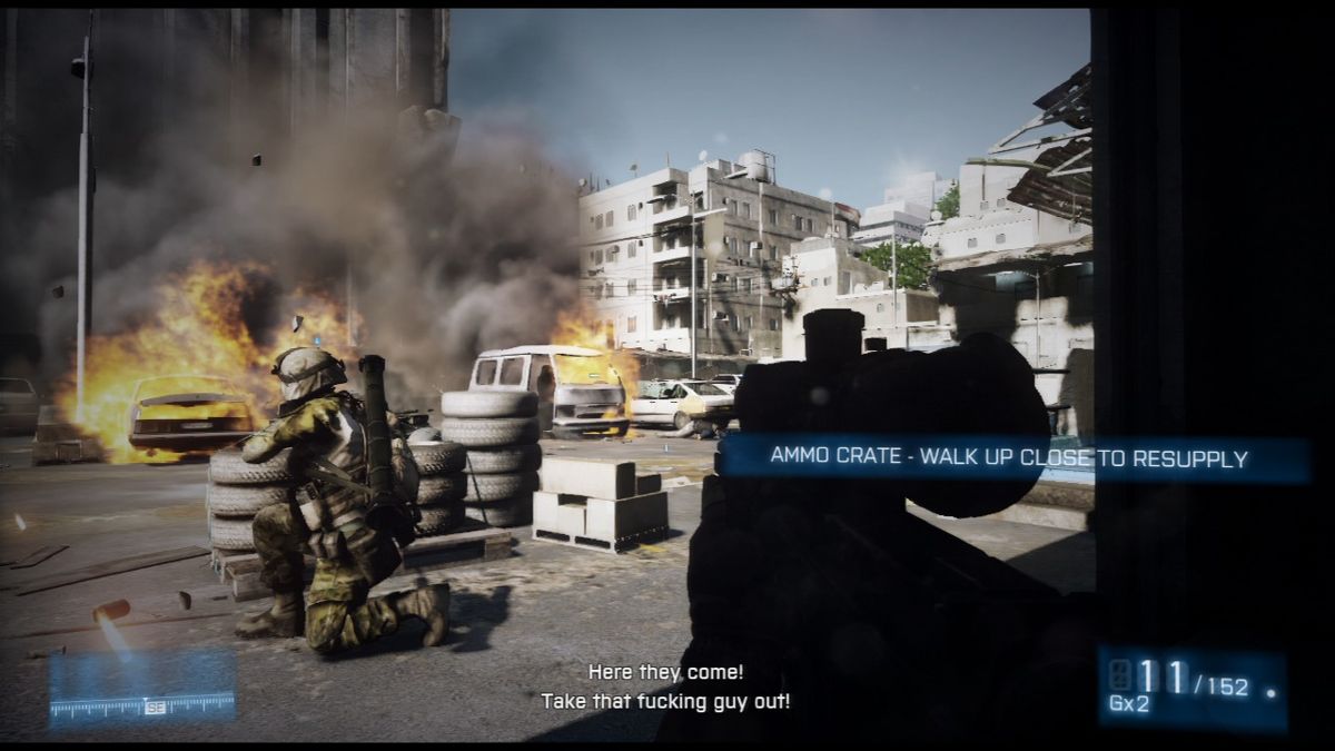 Battlefield 3 is the direct sequel to 2005's Battlefield 2 and is the 11th overall entry in the Battlefield franchise. Powered by the Frostbite 2 engine, Battlefield 3 aims to provide the fast paced, team oriented online multiplayer the series has made its name upon while also providing the first true single player campaign in a numbered Battlefield game, and for the first time in any Battlefield game numbered or not is a cooperative mode. The game also introduces the Battlelog feature, an in browser service which gives in-depth statistics for individual soldiers such as their Win/Lose ratio, their favourite weapon, how accurate they are - and so forth. Battlelog also allows players to create Platoons which are not unlike clans which track the stats of a combined group, allows for scrimmaging, voice communications, and parties which will attempt to bundle friends and platoon members into squads together if possible. The game is also launched from Battlelog although settings are altered in game.