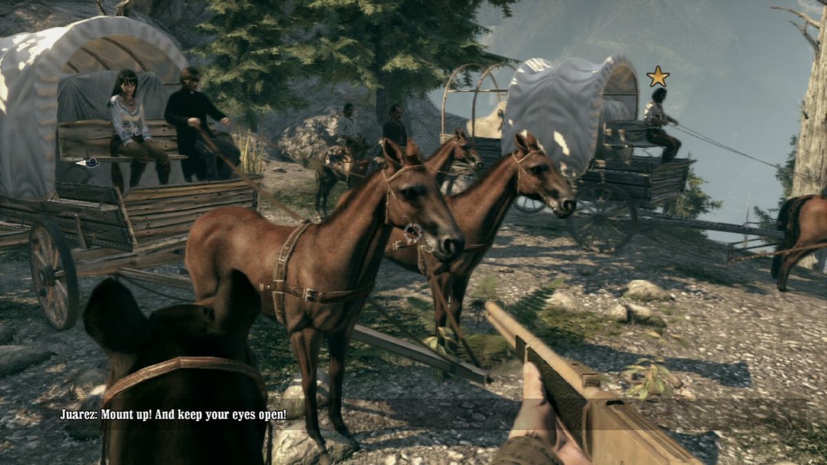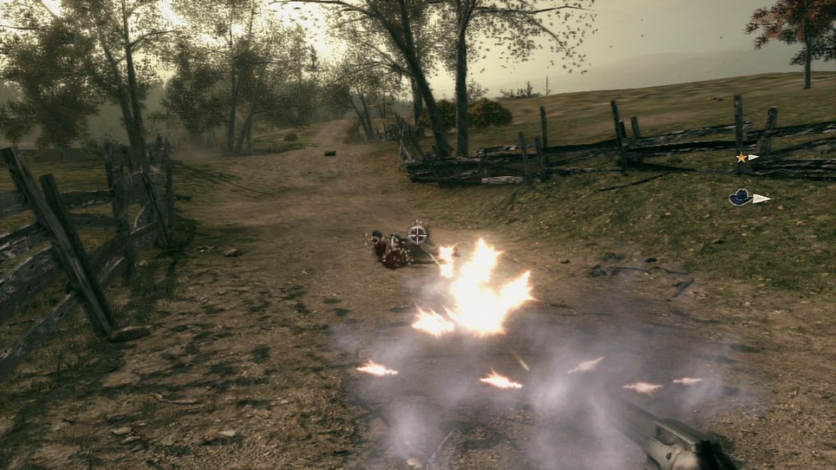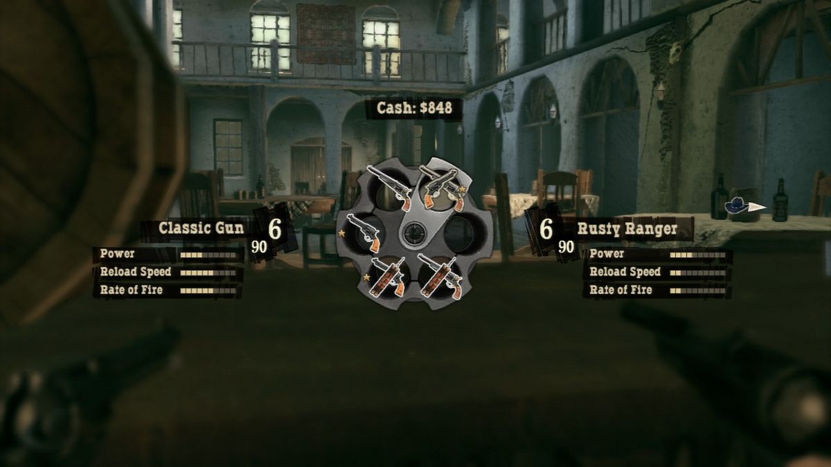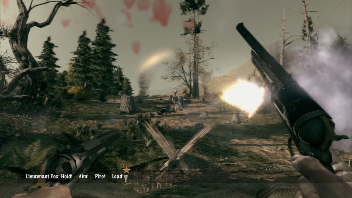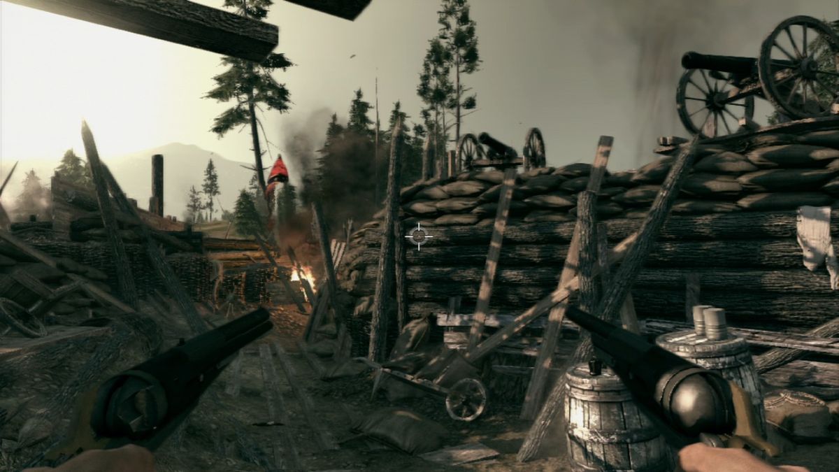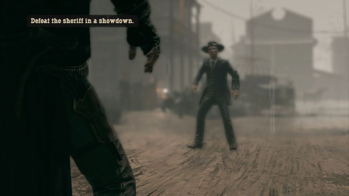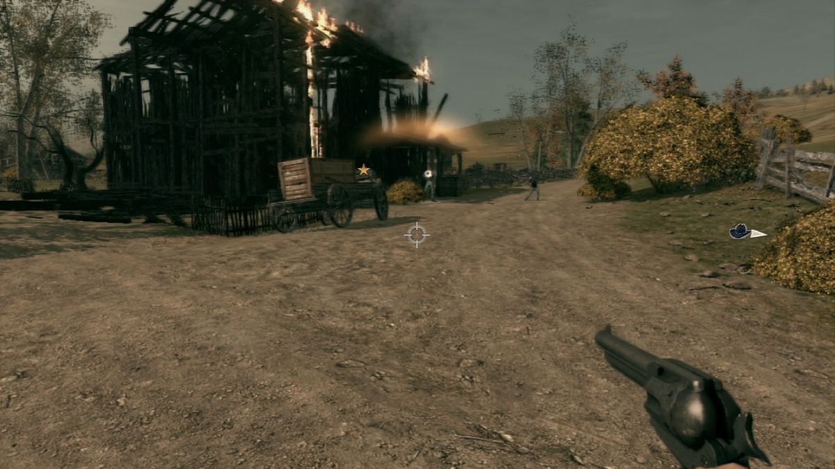 At the beginning of a level, the player normally has the option to choose between playing either Ray or Thomas. Only in a few missions the game decides this. Choosing with which character to fight his way in first-person-shooter style through the levels greatly influences the gameplay. While Ray shoots first and asks questions later, he can neither climb over obstacles nor use bows or throwing knives for stealth kills. On the other hand Thomas could not even kick in a door if his life depended on it. So most of the time the two need to work together. Sometimes though the characters split up and the mission progresses differently for each one of them. In addition at certain points in the game the two use their coop concentration mode together, allowing them to simultaneously slow down time and use their two different special attacks to take down large groups of enemies. While Ray has to aim during concentration mode to unleash hell on his enemies afterwards, Thomas's cross-hair automatically jumps from enemy to enemy but requires the player to pull the trigger manually each time. Similar to the duels, in which the player needs to draw his gun in one move before he can fire, this is done by performing a virtual backwards pull with the mouse or the analog stick. To limit the access to concentration mode, its "power" needs to replenished by killing six enemies and only holds for a certain amount of time if not used before it vanishes.