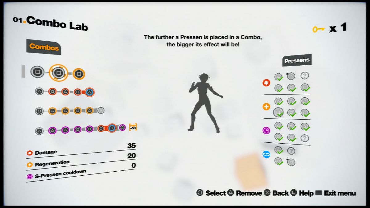 Remember Me is an action-adventure game where the gameplay stems from "memory remixing", which involves entering the memory of the target and then rearranging and manipulating the memory, the goal being to change how the target recollects the memory. Combat is conducted through customizable combos, where players create and customize their own combo moves through the Combo Lab. There are four different types of skill families available to players, called Pressens, which include Regen (healing), Power (damage), Chain (duplication or doubling of previous moves), and Cooldown (regeneration of S-Pressen energy). S-Pressen moves are special moves developed as the game progresses, ranging from moving at high speeds to taking control of enemy units. There are over 50,000 customizable combos available for the player to use.