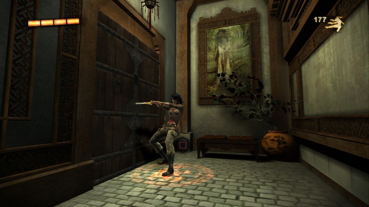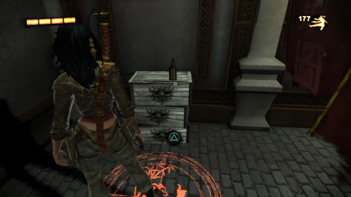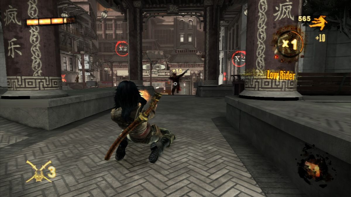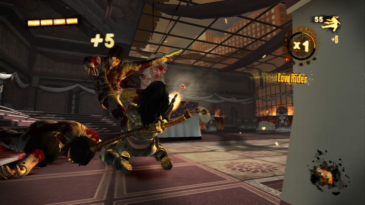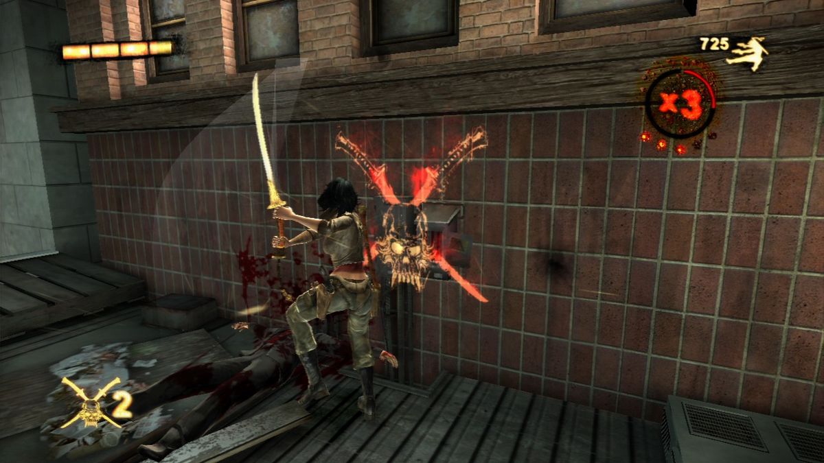 Similar to John Woo presents Stranglehold, Wet is a third-person-shooter with a strong focus on acrobatic stunts. While Rubi can kill enemies with her assortment of four different types of weapons (two pistols with unlimited ammo, two shotguns, two machine pistols and two crossbows) just by walking around shooting, she doesn't do much damage that way and is very slow. Instead she needs to jump around, slide across the floor or walk on the walls which instantly slows down time until she touches the floor again. During these moves she can also use both of her weapons to target one enemy automatically while manually using the crosshair to target another. For every kill she makes she gets points and depending on how fast and how "stylish" she kills enemies, her points multiplier increases up to x5. The multiplier is especially important, since Rubi only regenerates health when the multiplier is active, making her nearly invulnerable once she reaches and successfully holds x5. The only other way to regenerate health is to drink from whiskey bottles scattered around the levels. Earned points are used to buy new moves or upgrade existing ones as well as her weapons. She also has access to a sword which she uses as a door-opener and to cut down enemies in melee combat.