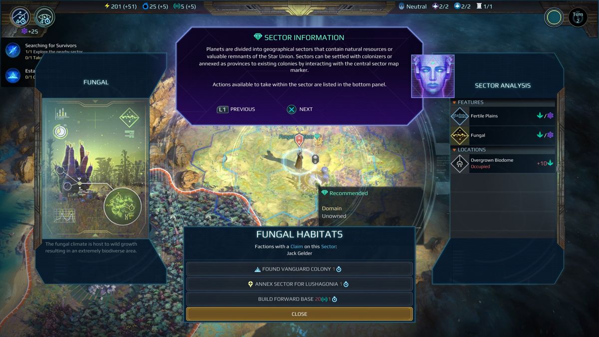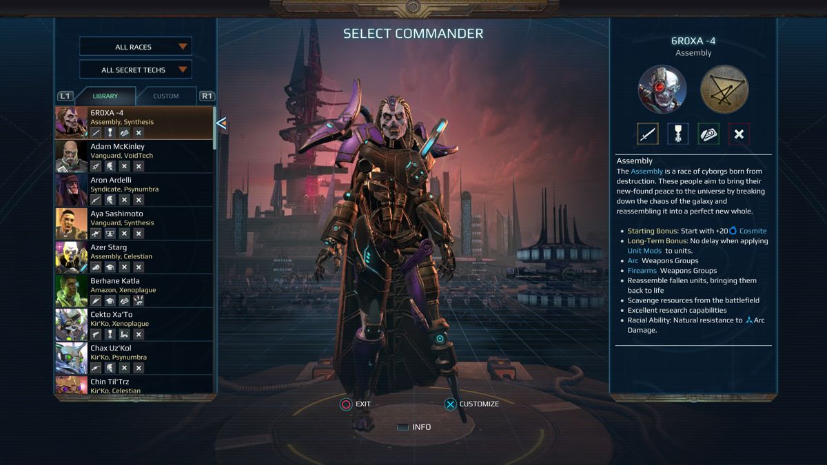 The base game includes six distinct races (Amazon, Assembly, Dvar, Kir'Ko, Syndicate, Vanguard). Alongside choosing and customizing the commander unit with different appearance, loadout and attributes, they can be assigned a "secret tech", which includes a secondary set of technologies, support powers and units which supplement the existing arsenals of the given faction. Research is split to two branches - military (new units, support powers, gear) and social (economic bonuses, new colony buildings).