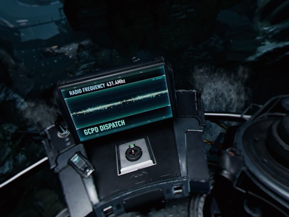 The VR headset is used to look around at any direction. Looking back can be done by turning your head, but the game also has a shortcut button that instantly turns 180 degrees so you end up facing what's behind for easier exploration. Movement is done by jumping to predefined spots rather than directly walking, and for longer distances Batman uses his grappling hook to move. Even though Batman's vehicles are present, the player doesn't get to drive them, nor even experience what's it like being inside. Instead, the game is more oriented on CSI part of exploration than on action. Batman does have his bat-shaped boomerangs, but rather than for taking down the enemies, it is used to reach distant areas to trigger some button or take down the plate revealing a level which can pulled with your grappling hook.