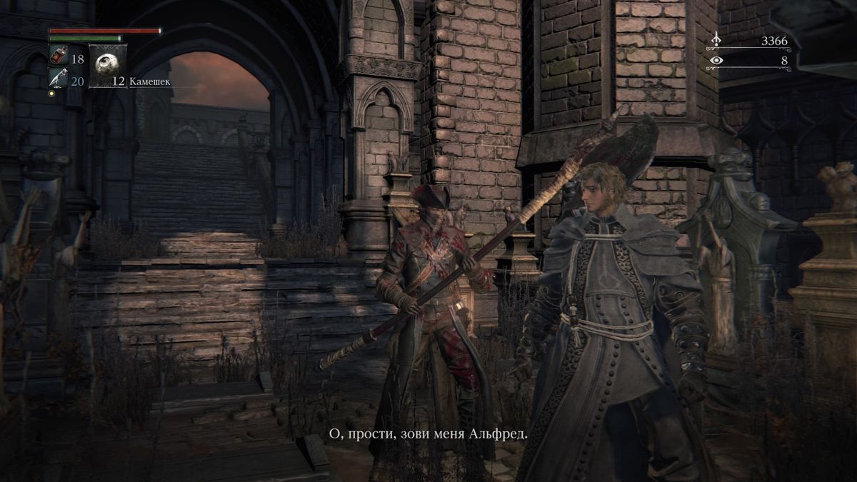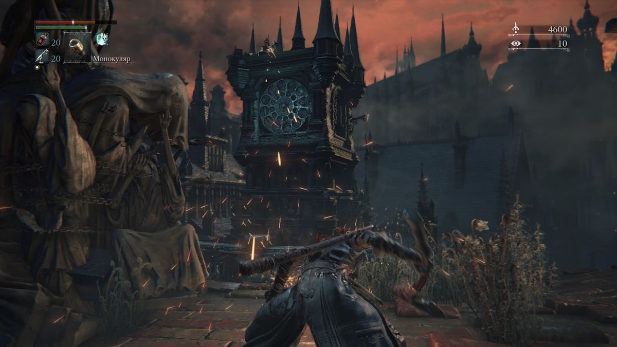 Gameplay for combat, movement and exploration is largely similar to the Souls games. The weight statistic has been removed, there is less focus on defense and spells, and more on dodging. Rather than holding down a button, dodging is now an active and timing-based skill. The stamina bar is now more forgiving for multiple actions in succession. The amount of gear is more limited and the statistics are downplayed in favour of fighting skills for specific weapons. The main-hand weapon is generally melee while the off-hand usually holds a firearm mainly for combos and to riposte counter. An aggressive approach is rewarded through a new Regain system where certain attacks are rewarded with health after being hit, removing the need to run away and heal before continuing the fight. Generally, health is restored through vials (found or purchased), replacing flasks in the previous games. Through the Insight stat enemy placement and attacks are influenced. Reaching a certain level also often brings new elements into the game world and changes how the world reacts to the protagonist. Some enemies are able to absorb souls, forcing you to reclaim them. Insights is also used as a currency to buy special items and are required to summon other players. Next to the main weapons, there are ten trick weapons, very powerful ones that have two forms that can be switched on the fly.