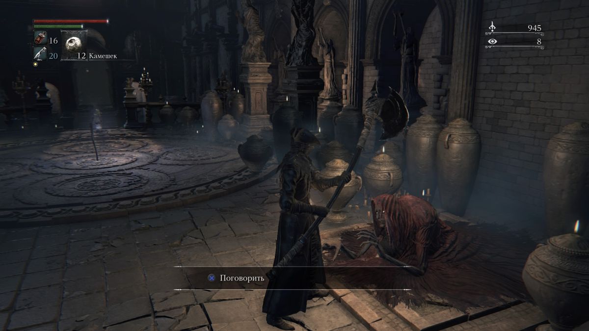 Early on in the game Hunter's Dream is discovered, a location in another realm that acts as a central hub similar to The Nexus in Demon's Souls. It is possible to warp there from the main game world after locating lamps. These lamps replace the bonfires of the previous games and it is still only possible to save at those locations. The hub has different messengers to buy and sell items, a workshop to upgrade and repair weapons, storage for inventory management, and a memory altar (through Caryll Runes). Through the Headstones of Awakening, it is possible to warp to different parts of the world and Ritual Altars to access the Chalice Dungeons. These dungeons are randomly generated dungeons away from the main city players can explore. Layouts can also be shared or be found online. The two main characters in Hunter's Dream are the wheelchair-bound Gehrman who provides advice and the life-size doll called Doll who helps level up. Next to the hub world, it has the interconnect world known from the Dark Souls games.