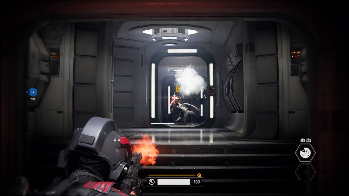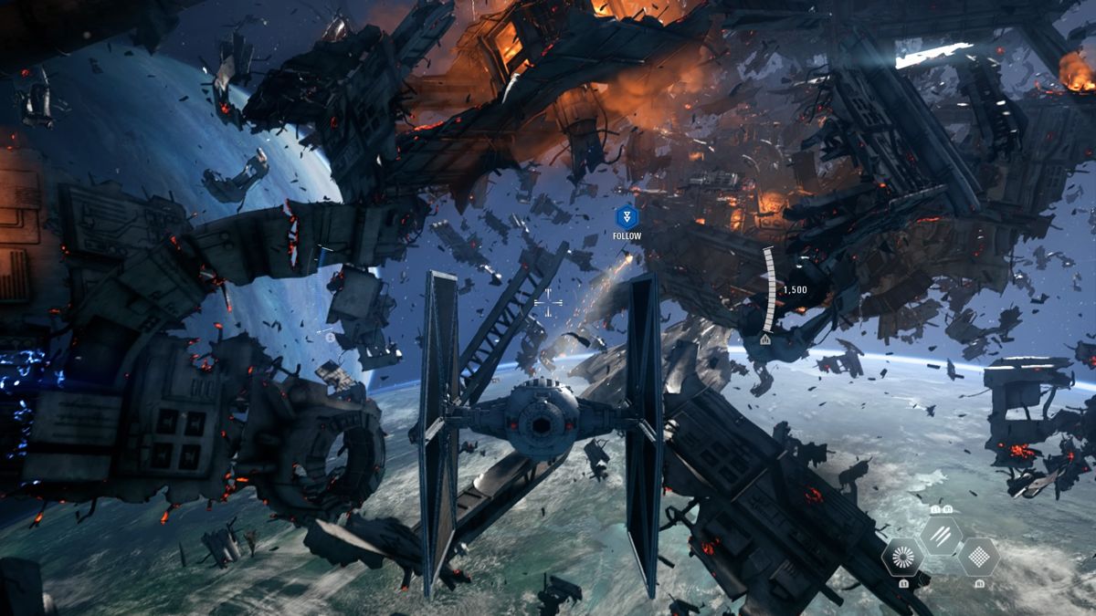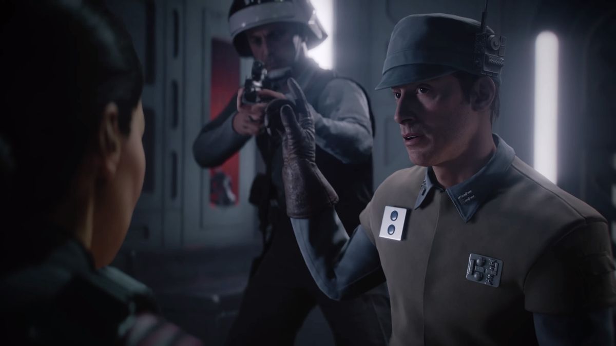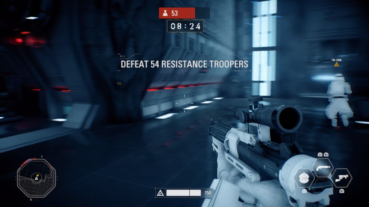 While the story protagonist is Iden Versio, certain missions also let you control other key characters from the Star Wars universe, namely Luke Skywalker, Leia Organa, and Han Solo. At any point during gameplay the game lets you switch between 1st and 3rd-person perspectives with the exception that characters other than Iden can only be controlled in 3rd-person. There are a variety of pistols, rifles, rocket launchers and laser guns to choose from and equipment can be selected at the beginning of each mission or changed upon encountering weapons crates. As Iden switches sides in the story, the player also gets to control different types of space fighters such as X-Wings or Tie Fighters, as well as walkers such as AT-STs. Iden doesn't fight alone, however. Even when her team isn't with her, she has a trusty bot attached to her back which helps her dispose of her foes in a silent manner, hack open doors and access computers. Aside from story and multiplayer modes, there is also an arcade mode available which lets you choose an Imperial character and fight waves of enemy combatants in an allotted time offline. By earning more points, you get to unlock better weapons or characters, such as Kylo Ren. The arcade mode works as an introduction to gameplay and controls, becoming available while the game is still installing and the campaign and multiplayer modes cannot be played yet.
