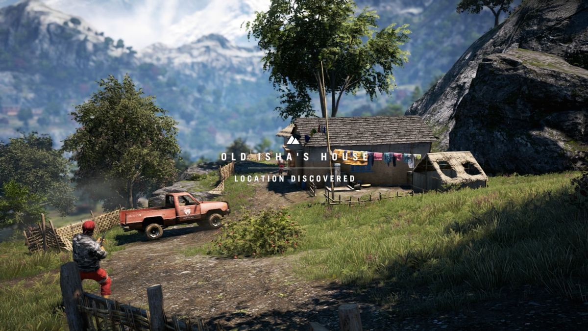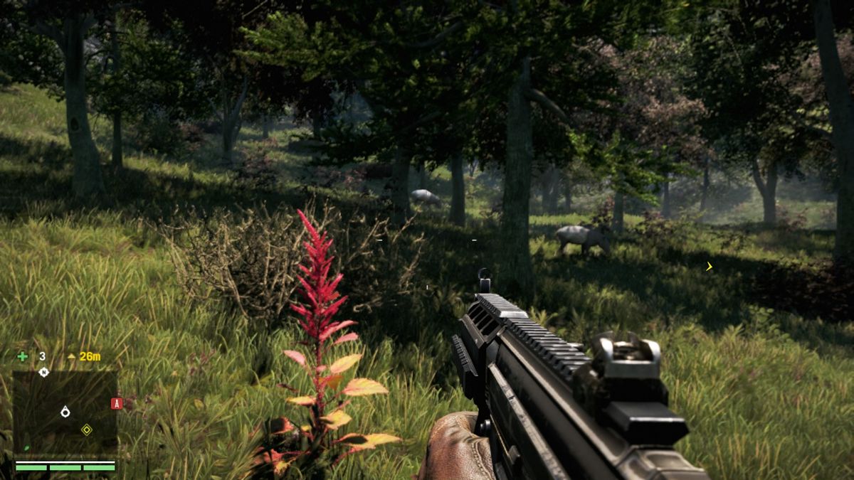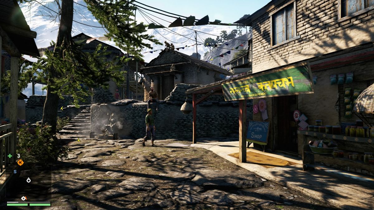 The mountainous region has both lush environments and snowy mountains. Vertical heights can be scaled using a grappling hook, and a glider or a zipline is used to move down. The player can follow the story missions or explore freely. Various vehicles are available to cross the distances and there is a fast travel option for important locations. There is an auto drive option where vehicles follow the roads to the next waypoint while the player can concentrate on shooting. Typical game elements that return are hunting animals (rhinos, pigs, bears, eagles, wolves, elephants ...) to craft upgrades, collecting plants for syringes, exploring locations for loot that can be sold at shops, trading points and sherpas, and a large amount of weapons including a bow, both melee weapons and long-ranged guns, grenades, mines, and explosives. It is possible to ride elephants as well. Next to the main quest there are various side quests and random karma events for separate karma points. Next to money and experience gained to level up, skills points are provided. These can be spent in The Tiger (aggressive) or The Elephant (defensive) skill tree. There are also a large amount of collectibles such as propaganda posters, masks, lost letters and pages of Mohan Ghale's journal.