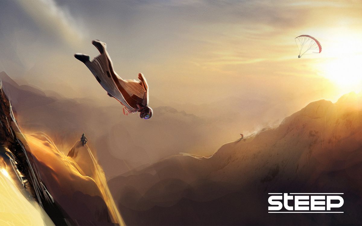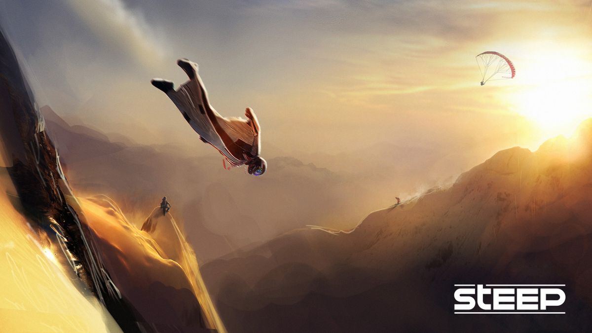 Steep is an open world winter sports game based around four extreme sports: paragliding, skiing, snowboarding and wingsuit flying. The game was launched with a mountain in the Alps to explore, but another set in Alaska was added for free at a later time. The player is free to explore and can walk around. At any moment it is possible to switch to one of the four sports and continue that way. There is no linear path to follow, but by unlocking base camps, spotting drop zones and accessing new challenges by leveling up, steady progress along an increased difficulty level is possible. At any moment the player can enter a top-down mountain view to quickly move between spots or challenges. Previous trails can be revisited, there are replays and it is possible to design and share challenges for other players. Players can also appear in each other's worlds to be invited to fly, ride of ski together.