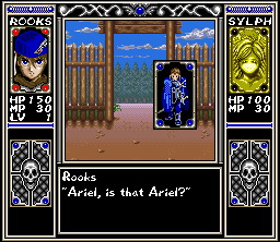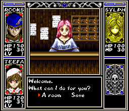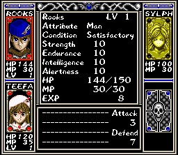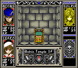 Arcana is a first-person RPG which focuses on the exploration of varied dungeon settings. A village serves as hub in which Rooks can visit places like a fortune teller or shops to buy items and equipment. On the world map, which does not offer free movement, he chooses his next destination where the dungeon crawl begins. The battles occur randomly and are turn-based: during each turn, the player chooses the next action of a character from a list of actions, e.g. attack or magic. Eventually the characters advance their experience level and therefore their stats.