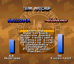The game features 24 college football teams from the 1993 season and 24 of the all-time college teams since 1978. Play modes include exhibition, playoffs and all-time playoffs and the SNES version also has an eleven week season mode with the National Championship as the ultimate goal.