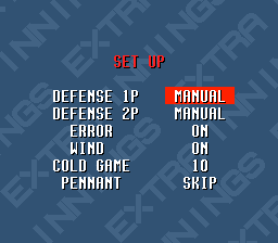 Options include either having automatic or manual fielding, having errors and/or wind on or off, and being able to either skip or watch opponents pennant games. There is also the Cold Game option, which lets a baseball game end when a team is winning by the chosen amount of runs.