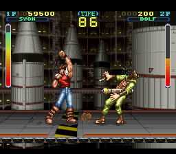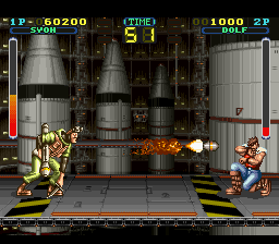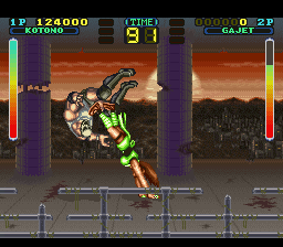 Following a great war that destroys most of the earth, Tuff E Nuff sees four of the earth's toughest people come together to do battle, and earn the right to attempt to depose the mighty ruler. Gameplay is standard beat 'em up style action, featuring most of the conventions of the genre. The characters have a range of kicks, punches and throws, and each fight at their own base. The 90-second time limit can be turned on or off. Fights are best-of-three, with points awarded for each hit, and for overall victory.