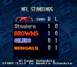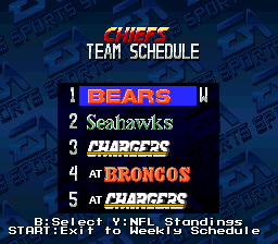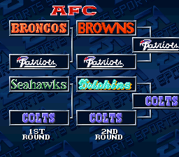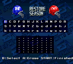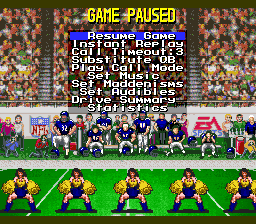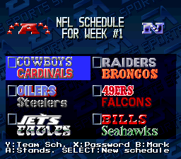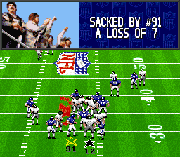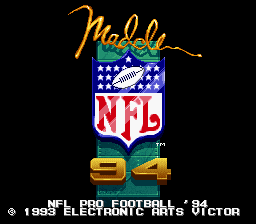 Madden NFL '94 is the third in the Madden series of football games for the SNES. It features 80 teams -- 28 teams from the 1993 season, 38 Super Bowl teams from 1966-1991, 12 All Star franchise teams since 1950, and two "All-Madden" teams: one for the 1993 season and one from a 20-year time span. You can play these teams in a regular exhibition game or sudden death overtime game, or take the 1993 teams through an entire season. You can also enter the playoffs with the 1993 teams, the Super Bowl champions, or the All Star franchise teams. Unlike many other sports games, saving a season is done by password rather than by storing the data into a saved game.