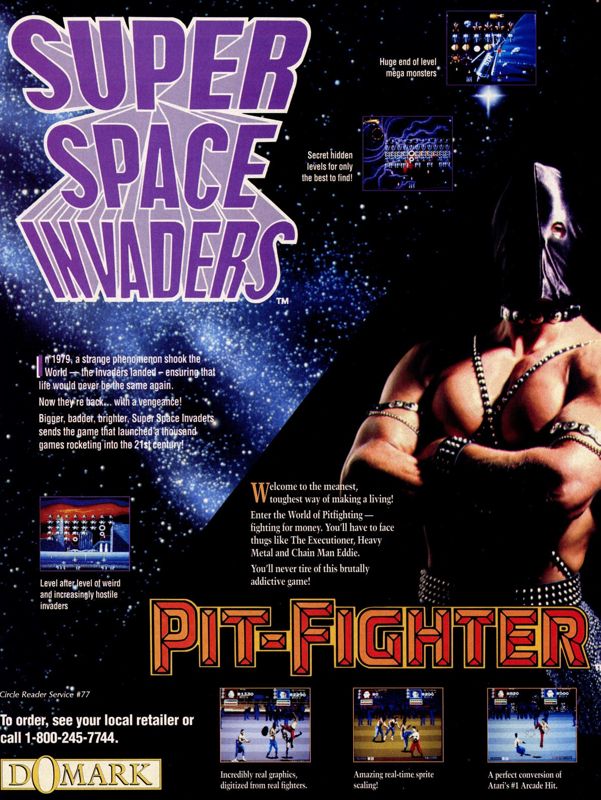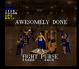 Pit-Fighter is a 3rd-person fight game that features digitized graphics of real fighters and zooming effects. Players select one of three fighters (Buzz, Ty or Kato) to take on anyone who dares. At the conclusion of a match, players are individually awarded a Knockout Bonus, Brutality Bonus, and a Fight Purse. Every third match is a Grudge Match where players test the skills of each other. The last man standing is the winner of this three-knockdown match. Players fight their way to the Elimination Match to decide who wins the opportunity to dethrone the champion, the Masked Warrior.