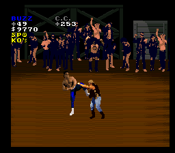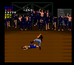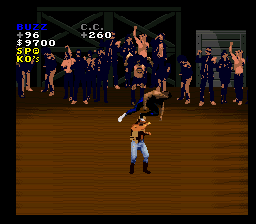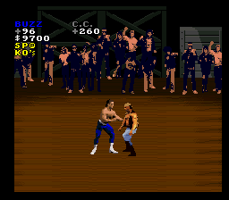 Your karate abilities, boxing skills, and wrestling techniques will be put to the test as you battle the roughest fighters ever to enter the pit. You and your tag team must defeat a series of opponents on the road to the championship. There's no such thing as fighting dirty when there are no rules, so do whatever you have to do to win. If you see a barrel near the pit, pick it up and throw it at your opponent. When your opponent is down, nail him. Everything counts. To win, you must give your opponent a worse beating than he gives you. Make no bones about it, your opponent will hurt you. But you must hurt your opponent even more.