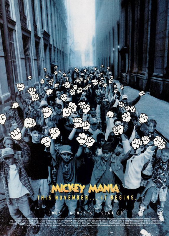 Mickey Mouse gets a chance to go down memory lane and walk through the timeless adventures he has lived. Mickey Mania is a platformer where all the levels are based on Mickey's most famous cartoons. The levels range about 75 years, starting off with "Steamboat Willie" and going all the way to "The Prince and the Pauper".