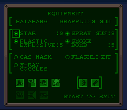 Besides kicks, throws and punches, Batman can use a variety of equipment against the enemies. Always available are Batarangs and the grappling hook. Before each mission, Batman can also select additional equipment, like knockout gas spray, throwing stars, smoke bombs and plastic explosives, all with limited ammunition. Special equipment required for certain levels include a flashlight, gas mask and X-ray goggles. If some necessary equipment is missing, it is always possible to return to the Batcave to change the gear and then restart the current level.